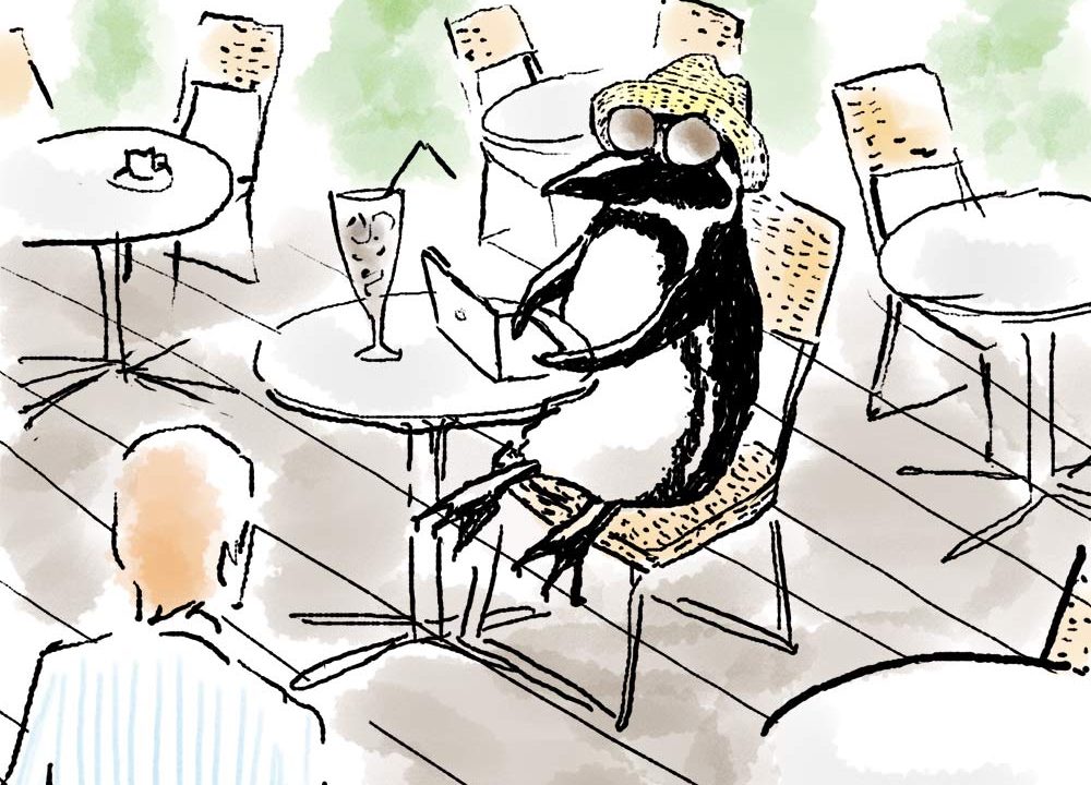 このペンギンは、ノートパソコンと携帯電話さえあれば、世界のどこにいてもサクッと仕事ができるのです。