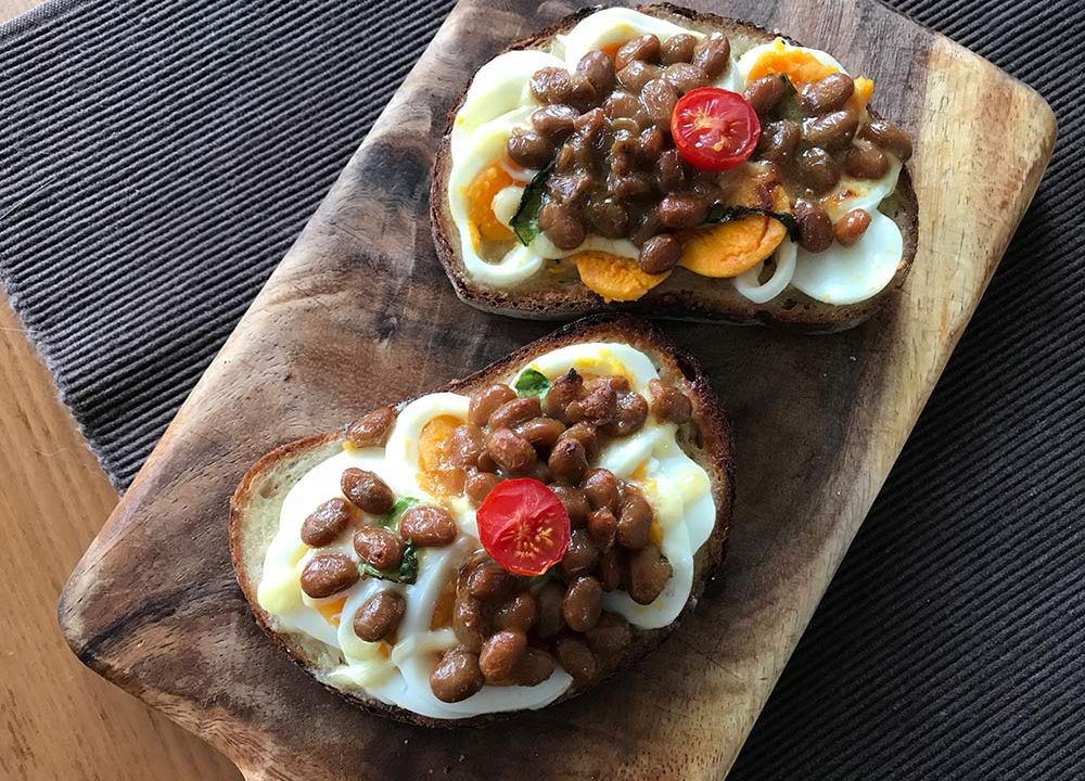 いい感じの半熟ゆで卵に「おいしくな〜れ」と唱えながらしっかりかいた納豆をトッピング。